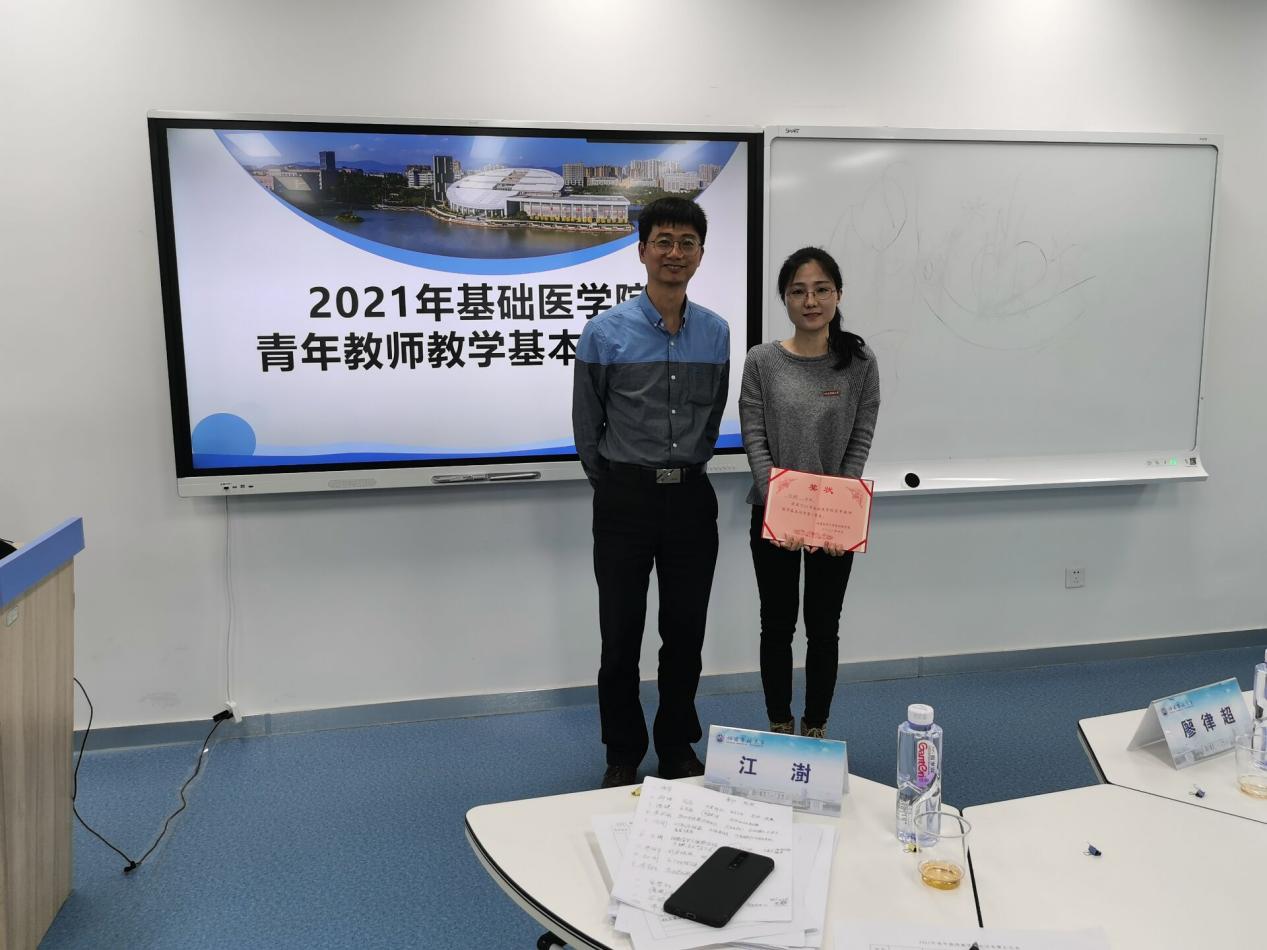 比赛最终成绩由教案评分、课题教学评分和教学反思三部分组成,并根据总成绩高低排序。经过激烈的角逐,本次比赛产生了一等奖1名,二等奖3名,三等奖2名(详细名单见附件)。根据比赛最终结果,推荐总成绩排序前2位,病理学系的郑琳老师和生物化学与分子生物学系的李景怡老师参加校级青年教师基本功竞赛。同时,推荐一等奖获得者郑琳老师参加“第四届全国基础医学青年教师教学基本功展示交流会”。最后,评委专家及学院领导为本次获奖的教师颁发了获奖证书。