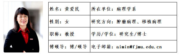 黄爱民教授,博士研究生导师,福建省高校教学名师奖获得者,The University of Texas-Houston Health Science Center访问学者,现任世界杯 党委副书记。长期从事肿瘤病理方向的研究,担任中华医学会病理学分会委员,全国高等医学教育学会临床医学教育研究会常务理事,《中华病理学杂志》等编委。福建省医学会常务理事,福建省病理学会副主任委员,福建省抗癌协会肿瘤病理专业委员会副主任委员,省级病理学重点学科带头人。在本科教学质量工程项目建设中成绩显著,为省级精品课程《病理学》负责人,省级病理学教学团队带头人,省优质硕士课程《高级病理学》负责人,部省共建“病理学与病理生理学特色优势学科实验室项目”负责人。主编《基础医学概论》、《医学形态学研究方法基础》,副主编和参编教材12部,其中入选卫生部和教育部国家级规划教材8部。