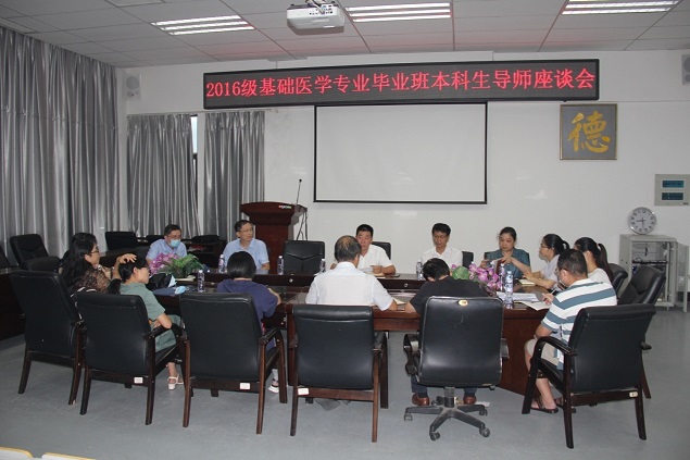 座谈会首先由教学办负责人向参会导师汇报了本年度毕业班学生培养工作安排,以及近期摸底调查的学生毕业设计(论文)进展情况和存在的问题。各位导师分别结合所指导学生的基本情况,围绕毕业设计(论文)开题时间、课题设计和毕业(设计)论文的成果展示形式等方面进行了深入交流探讨,一致同意按照本科生培养手册规定的时间节点,在9月底前由导师所在的系部组织相关本科生进行开题工作并上报学院备案。同时,2016级基础医学专业学生毕业设计(论文)答辩仍然以课题实验成果汇报和综述相结合的形式。
