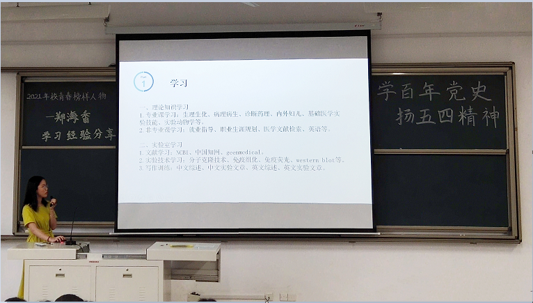 为深入贯彻落实习近平新时代中国特色社会主义思想和党的十九届五中全会精神,引导广大青年深入学习,推进青年学子向身边的“青春榜样”学习,2021年5月16日晚,世界杯 “聆听榜样声音”主题宣讲会暨院五四主题教育系列活动在71教顺利召开。本次宣讲会邀请2021年校五四“青春榜样”——科学技术类获得者2016级基础医学郑海香主讲。