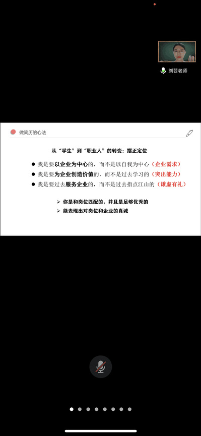 刘老师首先从求职简历的用途、人事主管评价标准等方面阐述了求职简历的功能和定位。然后,她介绍求职简历制作的注意要素,分析求职简历的结构和每个部分的关键要点取舍。最后,刘老师以若干同学的简历为蓝本,有针对性的进行指导。