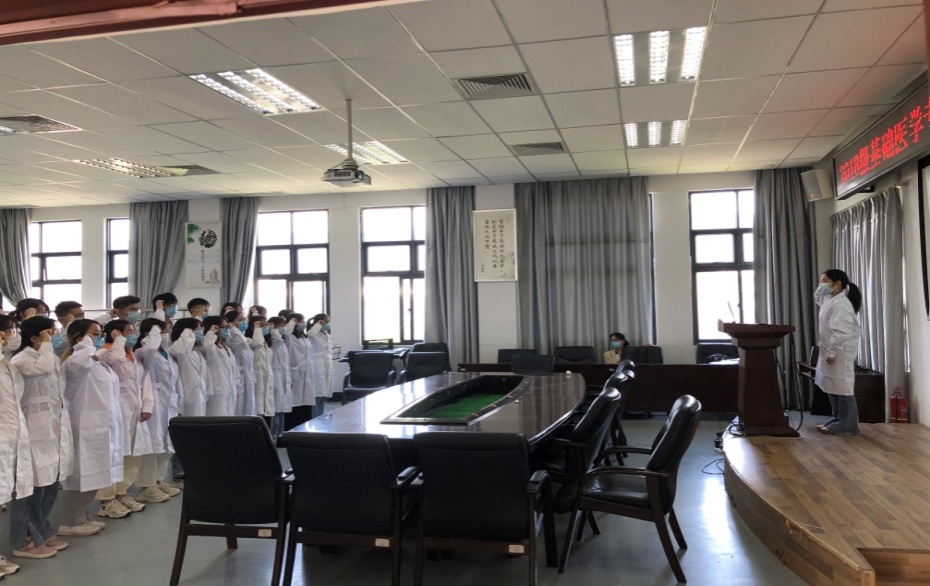 在动员会上,教学办李凌老师为大家解读了本次省立南院临床实习轮转安排。学工办任秀琼老师详细强调了临床实习期间的学生日常管理、纪律要求和请假制度。基础医学专业秘书林艺老师结合自己的临床实习经历,和同学们分享了临床实习心得,特别提到了同学们应当在临床实习前做好相关基础知识的复习和准备工作;在临床实习过程中应该主动思考、主动提问、主动学习;关心爱护患者,注意保护患者诊疗隐私等。念婷副书记在实习动员会中指出,同学们要带着敬畏之心、恻隐之心和探索之心“三颗心”去对待实习。实习过程中,同学们将会真切地体会到医学以及疾病的复杂性和不确定性,需要时刻秉承对病人的生命和健康高度负责的态度。实习期间,同学们的身份是实习生,也是医者,要学会换位思考,尊重病人。临床实习是将基础理论与临床实践相结合的过程,大家要深入思考临床实习过程中的所见所得,展现基础医学专业学子们积极向上的精神风貌、朝气蓬勃的工作热情、科学规范的学习态度,圆满完成此次临床实习任务。最后,专业秘书林艺老师带领全体实习生进行庄严的医学生誓言宣誓。