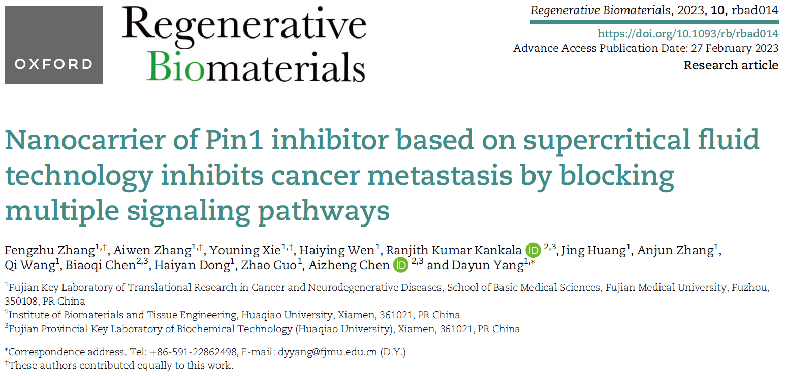 2023年2月27日,世界杯 杨达云副研究员课题组在Regenerative Biomaterials(中科院JCR一区)在线发表题为“Nanocarrier of Pin1 inhibitor based on supercritical fluid technology inhibits cancer metastasis by blocking multiple signaling pathways”的研究论文,该研究采用超临界流体技术制备了载Pin1抑制剂的PLA-PEG嵌段共聚物纳米微球,该纳米微球具有高的药物包封效率、优异的药物控制释放性能和好的生物安全性。该纳米微球不仅能够显著提高Pin1抑制剂对癌症生长的抑制作用,而且能够通过阻断多条信号通路和癌症上皮-间充质进展显著抑制癌症转移。由于该载药纳米微球能够将抑制癌细胞扩散和抑制癌症生长进行有效偶联,其为抑制癌症转移提供了新的治疗策略。