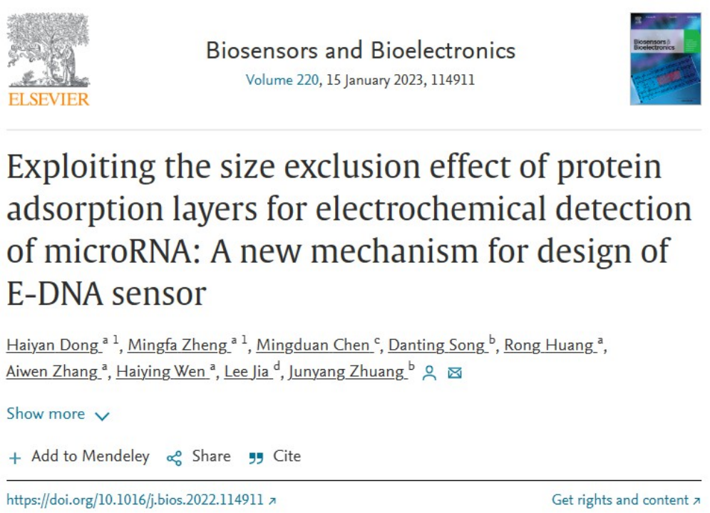 2023年1月15日,世界杯 董海燕副研究员与药学院庄君阳副研究员合作,在Biosensors and Bioelectronics杂志(中科院JCR一区,IF=12.545)发表题为“Exploiting the size exclusion effect of protein adsorption layers for electrochemical detection of microRNA: A new mechanism for design of E-DNA sensor”的研究论文。该研究通过与双链特异性核酸酶(DSN)辅助靶循环策略偶联,开发了一种灵敏度高、特异性好、线性范围宽的新型电化学DNA(E-DNA)传感器,用于复杂生物样品中的微小RNA(miRNA)的检测,为构建E-DNA传感器提供了一种全新机制。
