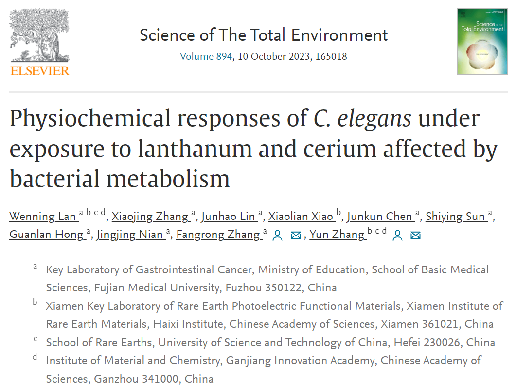 2023年6月21日,世界杯 张芳榕副研究员团队在Science of The Total Environment杂志(中科院JCR一区,IF=10.754)在线发表题为 Physiochemical responses of C. elegans under exposure to lanthanum and cerium affected by bacterial metabolism”的研究论文,该团队通过对不同浓度的稀土元素(镧、铈以及镧铈混合物)培养下的秀丽隐杆线虫(Caenorhabditis elegans)进行代谢组学分析,得到稀土元素在线虫体内呈现浓度依赖性蓄积,且低浓度范围促进生长,高浓度抑制生长及寿命。进一步经代谢组学数据结果分析得到,线虫上述的生理改变与稀土元素诱导的线虫体内的氨基酸代谢紊乱、膜紊乱和氧化应激等过程密切相关。并且在此基础上,探究了大肠杆菌代谢对稀土元素调控线虫所起的关键作用。该工作强调了稀土元素暴露下生物体内代谢水平的改变,深入了解稀土元素在代谢水平上的生物学影响。