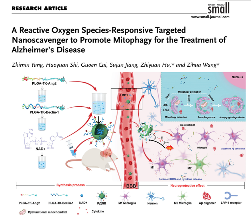 近日,世界杯 王子华副研究员和胡志远研究员团队在材料学TOP期刊Small (中科院JCR一区,IF=15.15)在线发表题为A Reactive Oxygen Species-Responsive Targeted Nanoscavenger to Promote Mitophagy for the Treatment of Alzheimer’s Disease”的研究论文。在该研究中,作者制备了一种ROS 响应的聚合物纳米载体P@NB,内部负载烟酰胺腺嘌呤二核苷酸 (NAD+),纳米载体表面修饰Beclin1多肽和Ang2多肽。通过恢复自噬通量加速Aβ降解并减轻过度炎症反应,从而改善AD小鼠的认知障碍。该研究表明,通过协同作用诱导自噬/线粒体自噬,使线粒体功能障碍正常化是一种有前途的AD治疗策略。