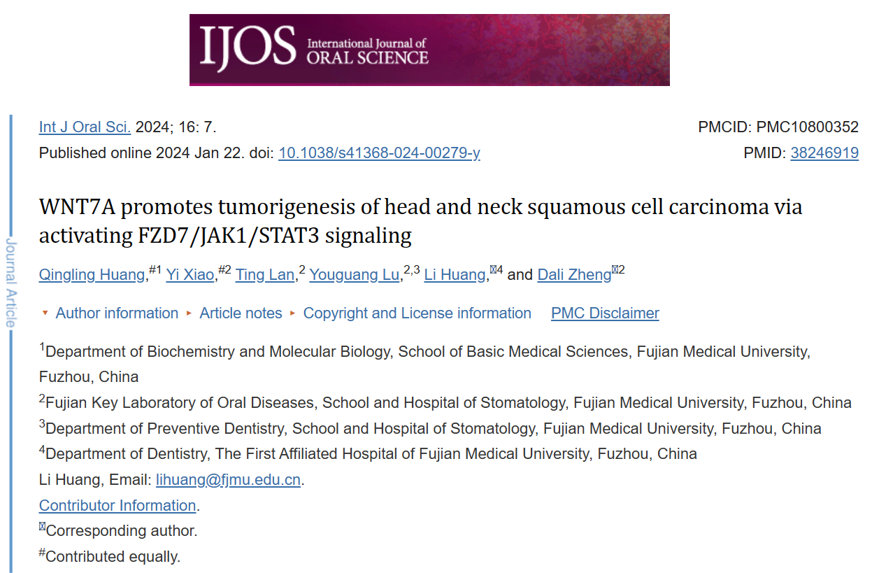2024年1月22日,世界杯 生物化学与分子生物学系黄清玲副教授以第一作者在International Journal of Oral Science杂志(中科院JCR一区,IF=14.9)在线发表题为WNT7A promotes tumorigenesis of head and neck squamous cell carcinoma via activating FZD7/JAK1/STAT3 signaling”的研究论文,该研究首次揭示了在头颈部鳞癌中高表达的WNT7A可以通过激活FZD7/JAK1/STAT3非经典Wnt信号通路在头颈部鳞癌的发生发展过程中发挥重要作用,有望为头颈部鳞癌的精准治疗提供新的靶标。