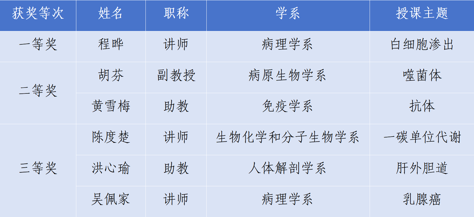 比赛最终成绩由教案评分、课题教学评分和教学反思三部分组成,并根据总成绩高低排序。经过激烈的角逐,本次比赛产生了一等奖1名二等奖2三等奖3名(详细名单见附件)。根据比赛最终结果,推荐总成绩排序前3病理学系程晔讲师、病原生物学系胡芬副教授及免疫学系的黄雪梅助教参加校级青年教师基本功竞赛最后,评委专家及学院领导为本次获奖教师颁发获奖证书。