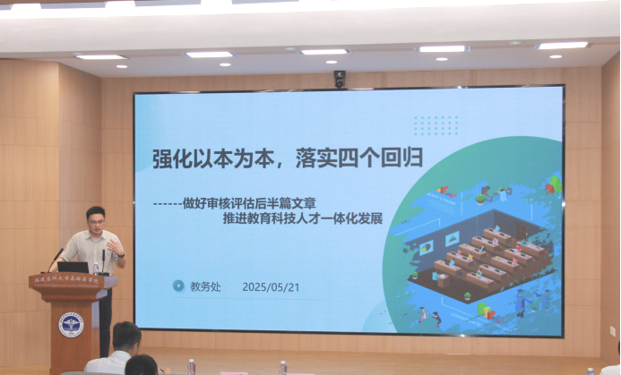 本次会议特邀教务处杨渐处长做《强化以本为本,落实四个回归——做好审核评估后半篇文章》为主题的讲座,直面本科教育教学审核评估中发现的核心问题,以“刀刃向内”的反思精神,直击审核评估中发现的核心问题,系统构建整改路径,为学校深化教育教学改革绘制精准“施工图”,为筑牢人才培养质量根基提出了参考建议。