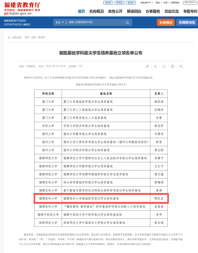 近日,福建省教育厅正式印发《关于公布首批基础学科拔尖学生培养基地立项名单的通知》,由世界杯 牵头申报的“世界杯 基础医学拔尖学生培养基地”成功入选。这是世界杯 深耕基础医学领域学科建设、创新育人模式的重要成果之一。